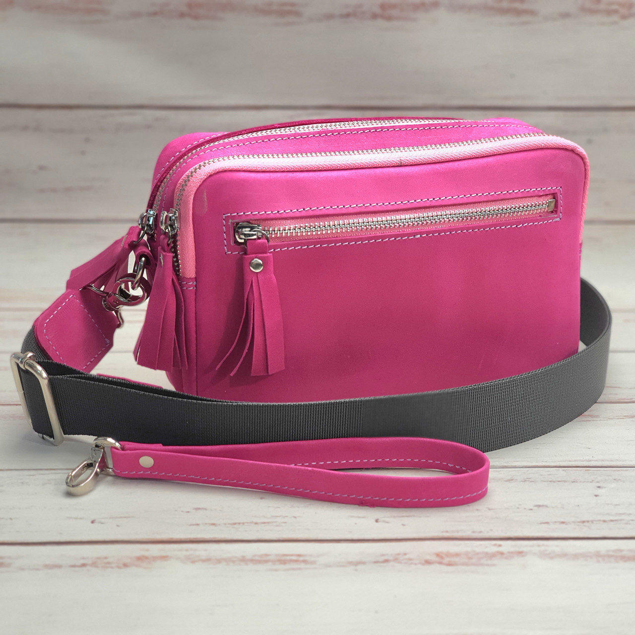 Сумка складається з 2 відділів, які закриваються блискавками. На передній фронтальній стороні розташована зручна, містка кишеня на блискавці Основне відділення має розміри 14*22*5 см. Усередині є потайна кишеня на блискавці і кишенька поменше для дрібниць. Розміри другого відділу 14*22*2 см. У ньому вшита візитниця і кишеня для дрібниць.