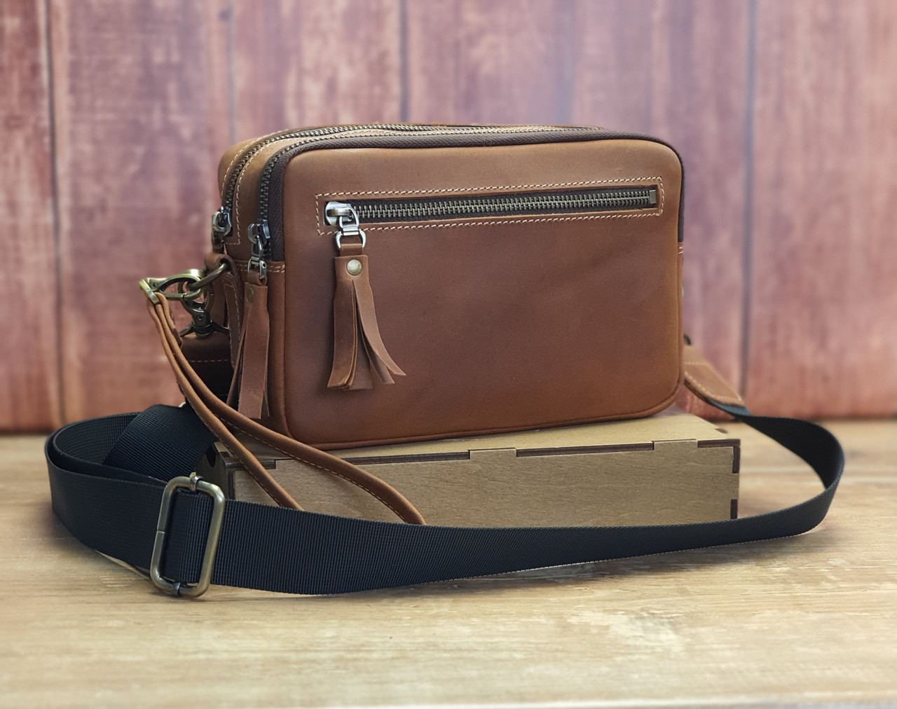 Сумка складається з 2 відділів, які закриваються блискавками. На передній фронтальній стороні розташована зручна, містка кишеня на блискавці Основне відділення має розміри 14*22*5 см. Усередині є потайна кишеня на блискавці і кишенька поменше для дрібниць. Розміри другого відділу 14*22*2 см. У ньому вшита візитниця і кишеня для дрібниць.